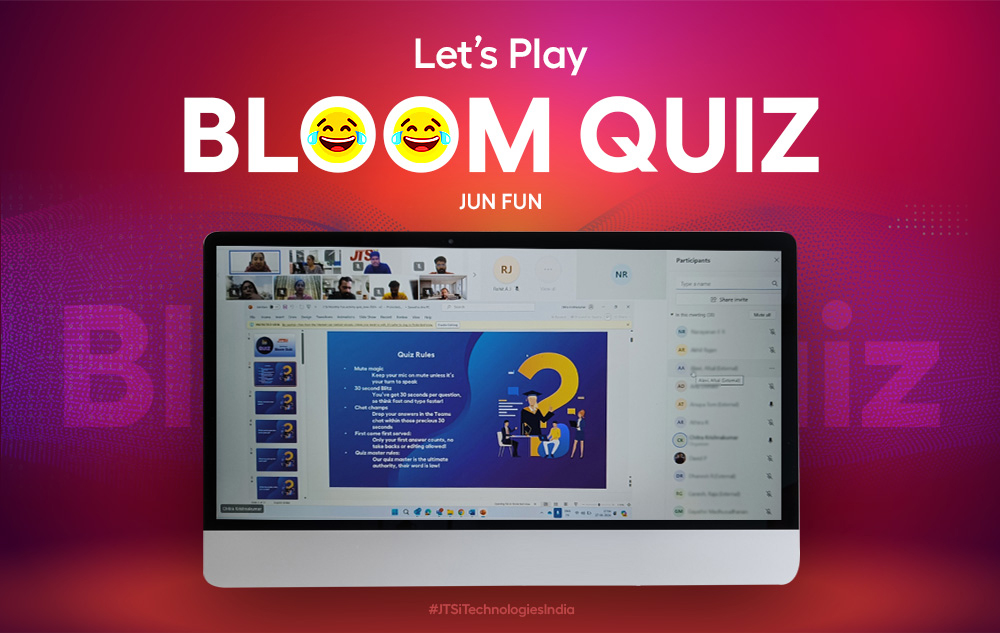 JTSi India's HR team, organized an exciting online quiz called "Online Bloom Quiz" on 26th June 2024, exclusively for the company's work-from-home employees. The quiz was conducted via screen sharing, where participants had to type their answers directly into the chat box.